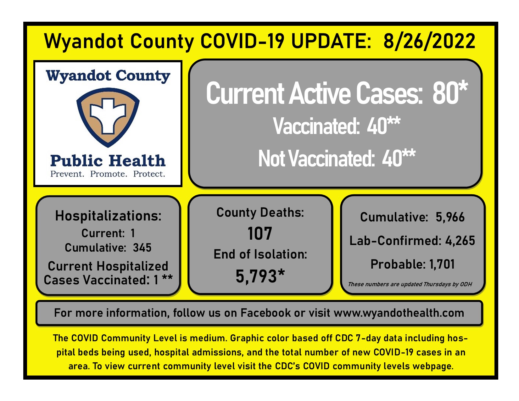 Walk-in COVID-19 vaccine clinics for 18 and older (Moderna and J&J) are 9 a.m. to 4 p.m. Wednesdays at Wyandot County Public Health. Appointments are available for upcoming COVID-19 vaccination clinics for youth ages six months to 17 years on Mondays and Fridays. To schedule call 419-294-3852. WCPH currently is out of COVID test kits. […]
