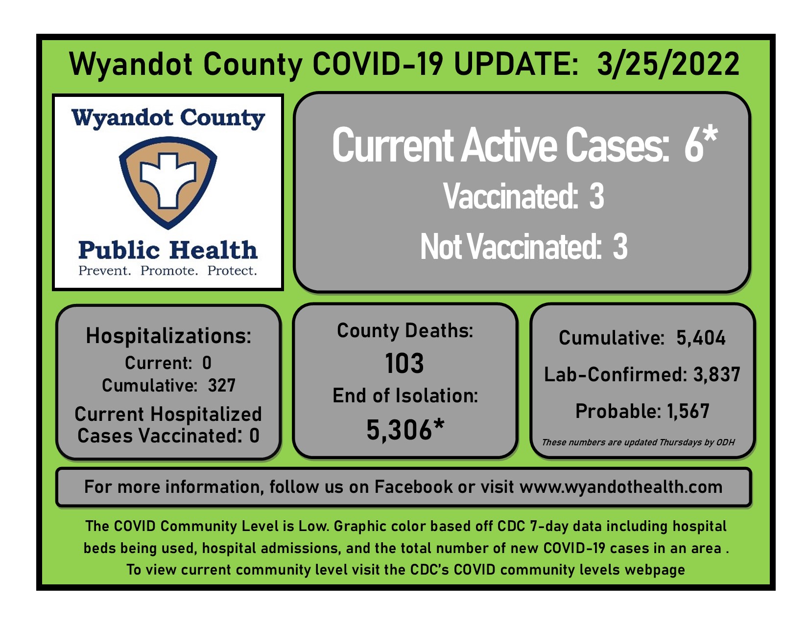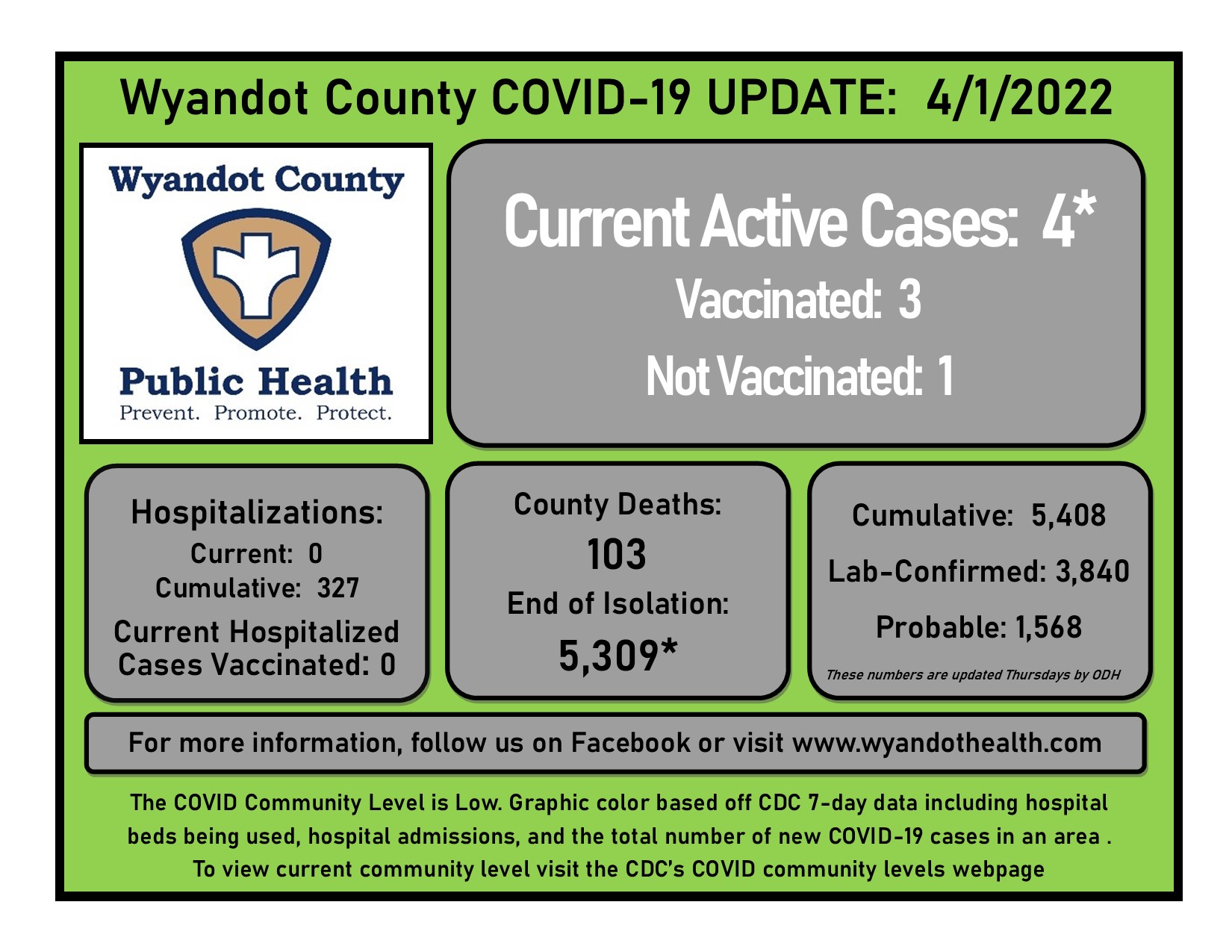 Walk-in COVID-19 vaccine clinics (Moderna and J&J) are 9 a.m. to 4 p.m. Wednesdays at Wyandot County Public Health. There are currently 5* active case of COVID-19 in Wyandot County. There are no patients currently hospitalized for COVID-19. Per the Ohio Department of Health, the cumulative case count since March 2020 is 5,409. This includes […]