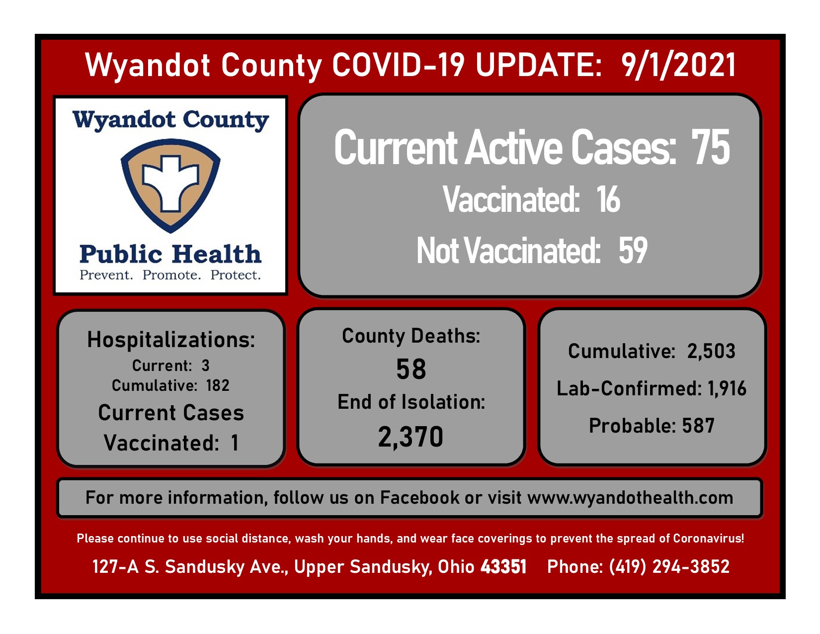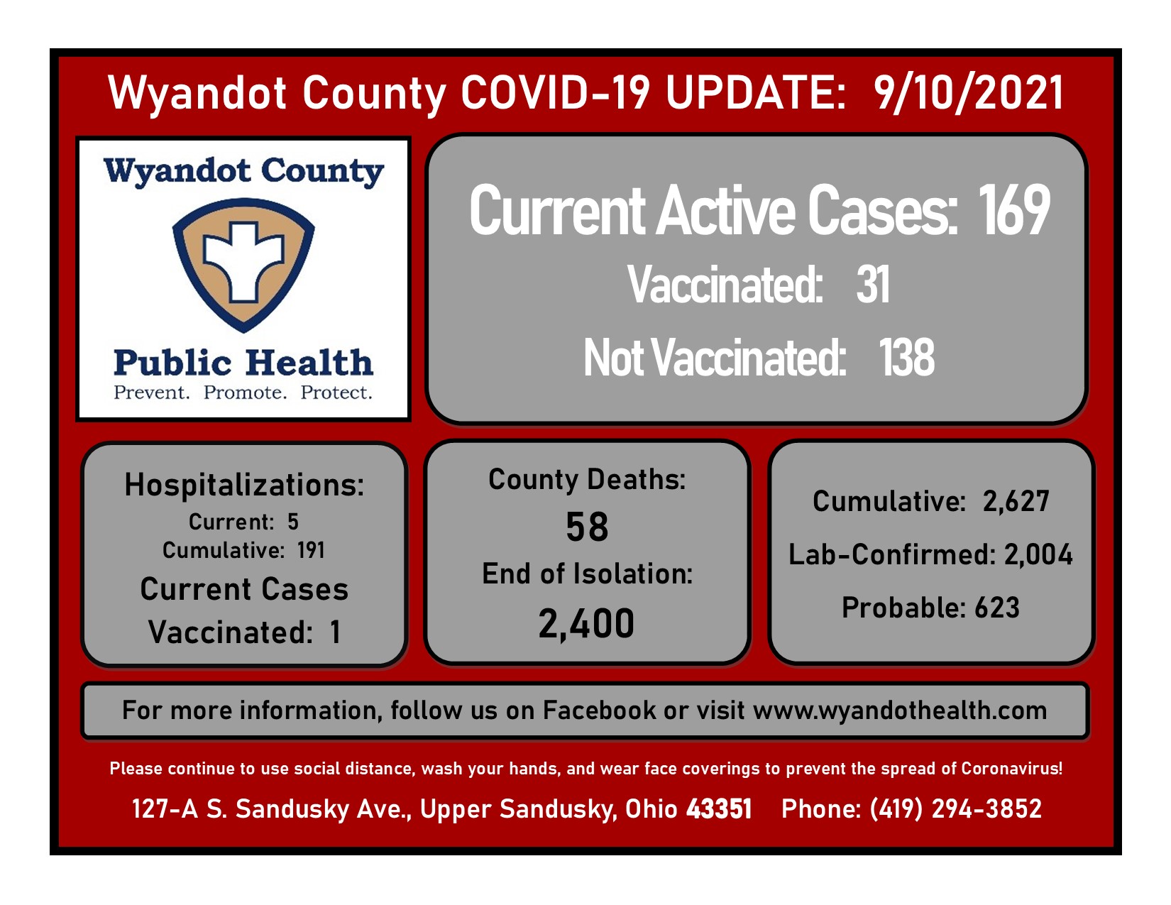 September 15, 2021 Wyandot County Public Health COVID-19 Update: The background color of the graphic denotes the rate of transmission of COVID-19 in Wyandot County according to the CDC. https://covid.cdc.gov/covid-data-tracker/#county-view Open COVD-19 Vaccine Clinics (Moderna) will be held on Fridays from 9am-4pm at Wyandot County Public Health. There are currently 197 active cases of COVID-19 […]