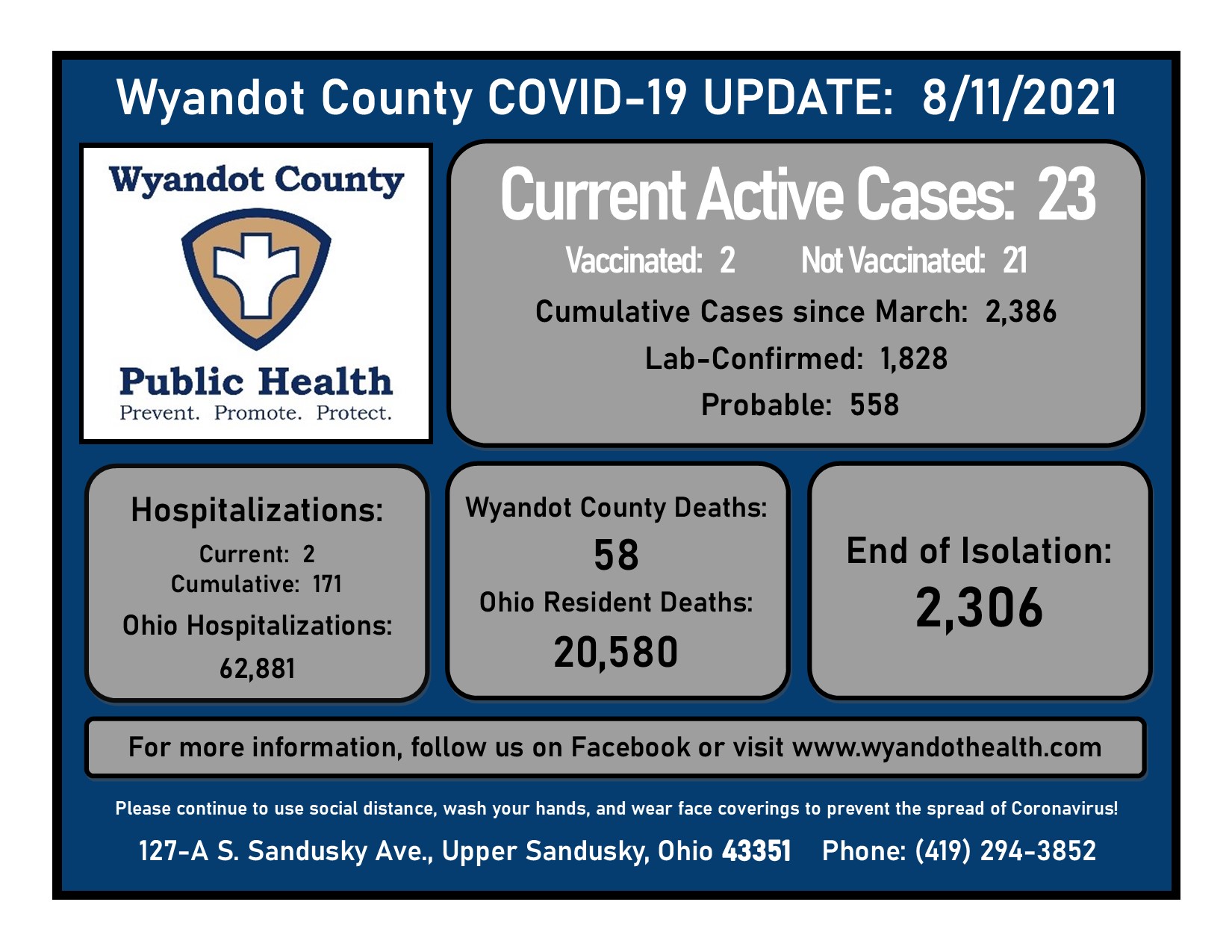 August 25, 2021 Wyandot County Public Health COVID-19 Update: *The background color of the graphic denotes the rate of transmission of COVID-19 in Wyandot County according to the CDC. CDC Covid Data Tracker Open COVD-19 Vaccine Clinics (Moderna) will be held on Fridays from 9am-4pm at Wyandot County Public Health. There are currently 77 active […]