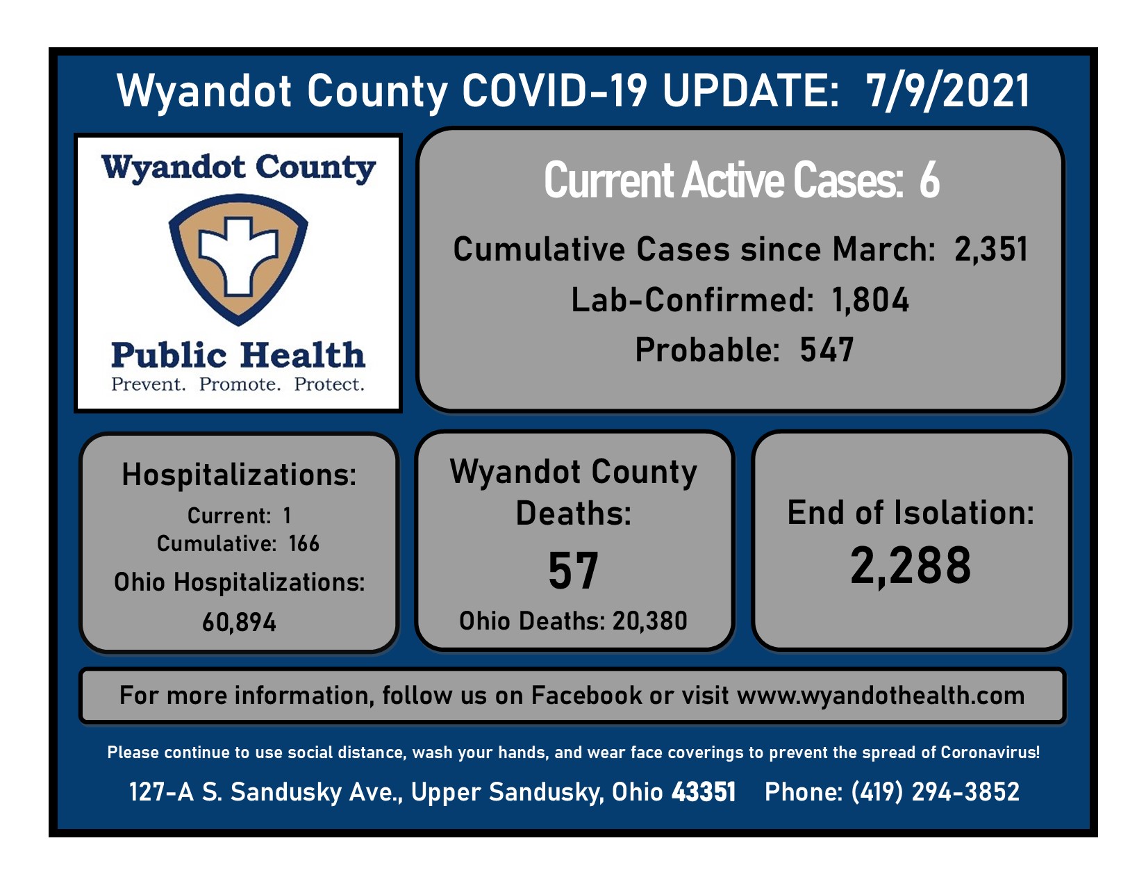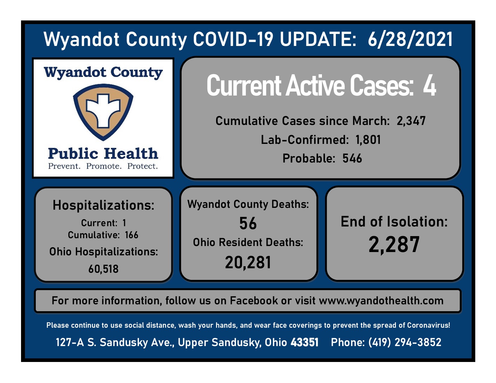 July 9, 2021 Wyandot County Public Health COVID-19 Update: Open COVD-19 Vaccine Clinics (Moderna) will be held on Fridays from 9am-4pm at Wyandot County Public Health. Limited Quantity of Johnson & Johnson vaccine will also be available. View Ohio Department of Health’s COVID-19 Vaccine information here: COVID-19 Vaccination Dashboard (ohio.gov) There are currently 6 active […]