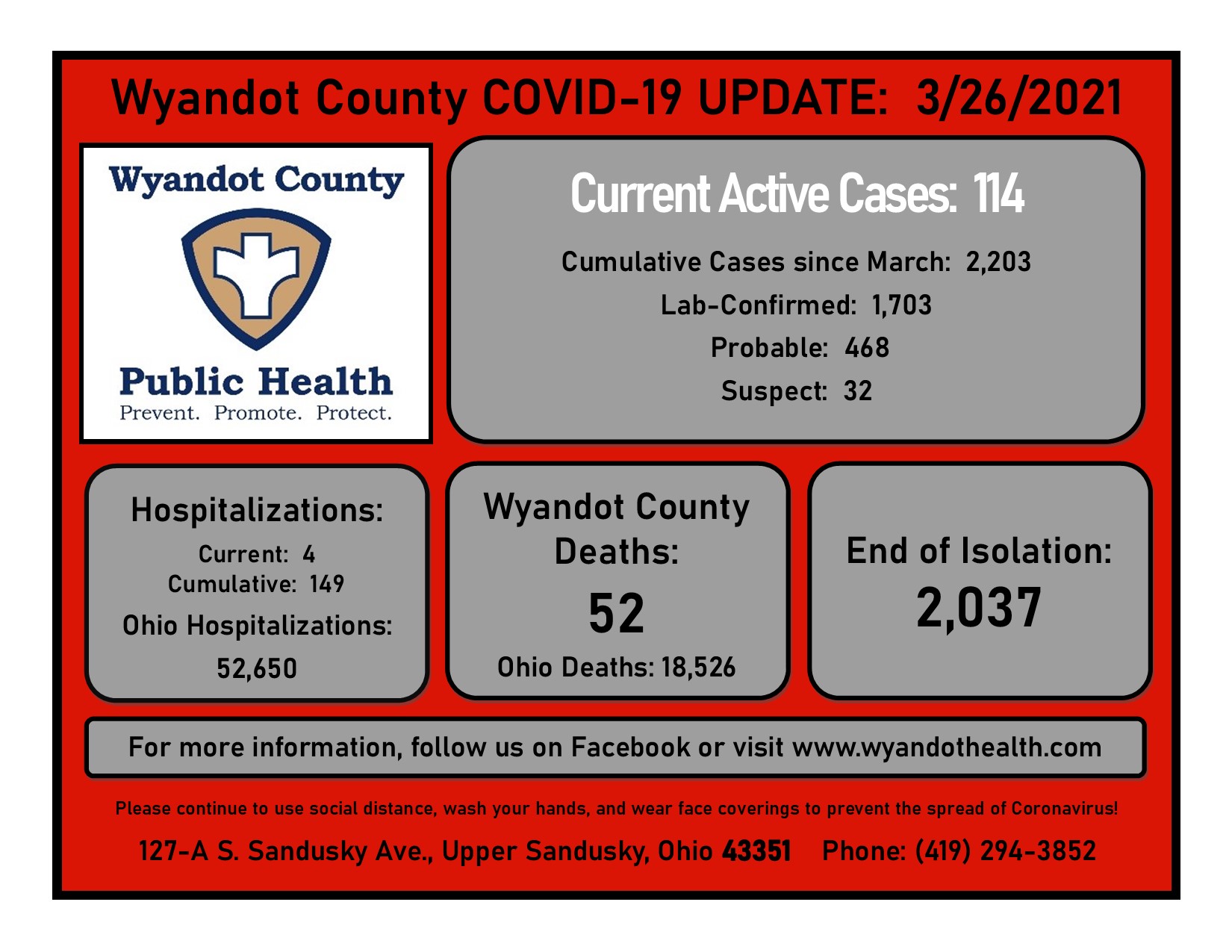 April 13, 2021 Wyandot County Public Health COVID-19 Update: Anyone can preregister for the COVID-19 vaccine here: wyandotgetvaccinated.com. Enter your contact information and health history, and we will contact you when vaccine is available. If you have friends or family that need assistance preregistering, we encourage you to help them if they are interested in […]
