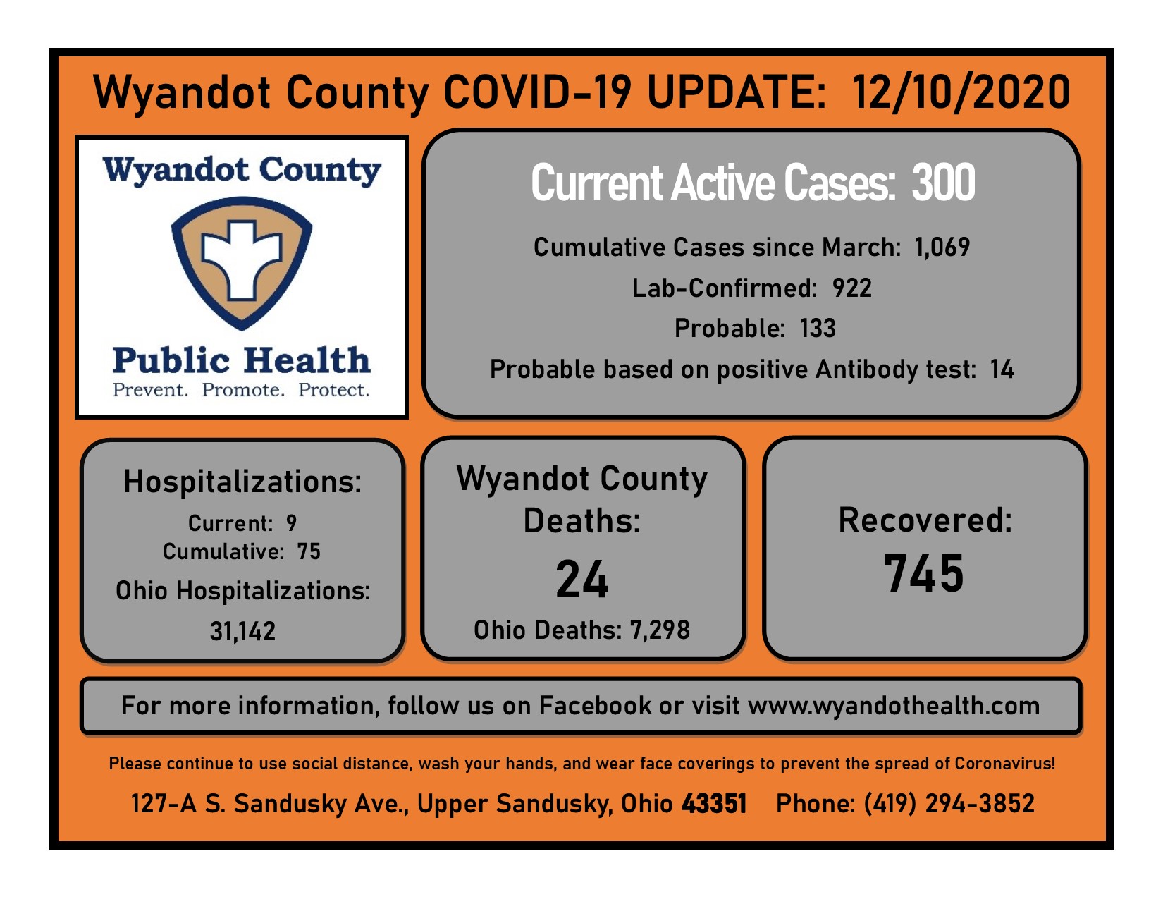 December 23, 2020 Wyandot County Public Health COVID-19 Update: There are currently 495 active cases of COVID-19 in Wyandot County. The cumulative case count since March 2020 is 1,455. This includes 1,215 lab-confirmed cases, 226 probable cases, and 14 probable cases based on positive antibody tests. There are currently 15 patients hospitalized for COVID-19. Of […]