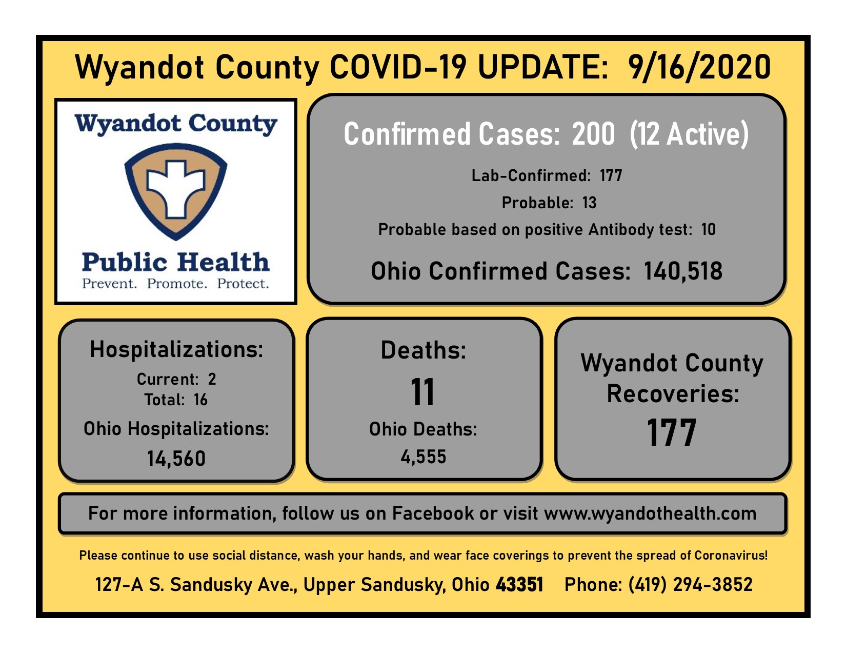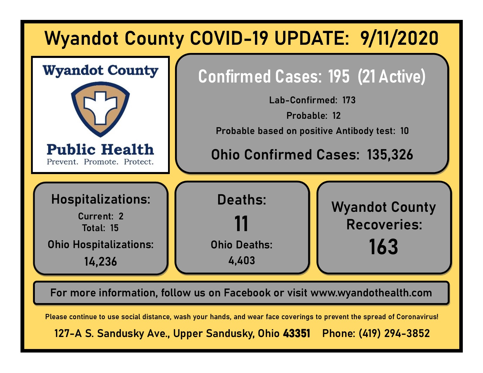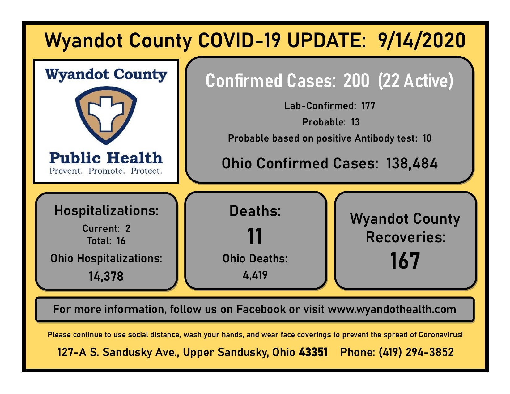 September 25, 2020 Wyandot County Public Health COVID-19 Update: Today we are reporting a total of 210 coronavirus cases. This includes 184 lab-confirmed cases, 16 probable cases, and 10 probable cases based on positive antibody tests in Wyandot County. There is currently one patient hospitalized for COVID-19. Of the reported individuals, there have been 12 […]