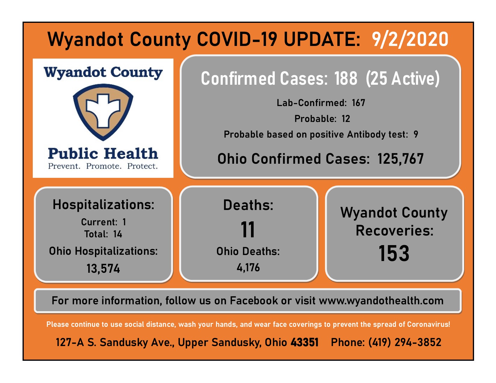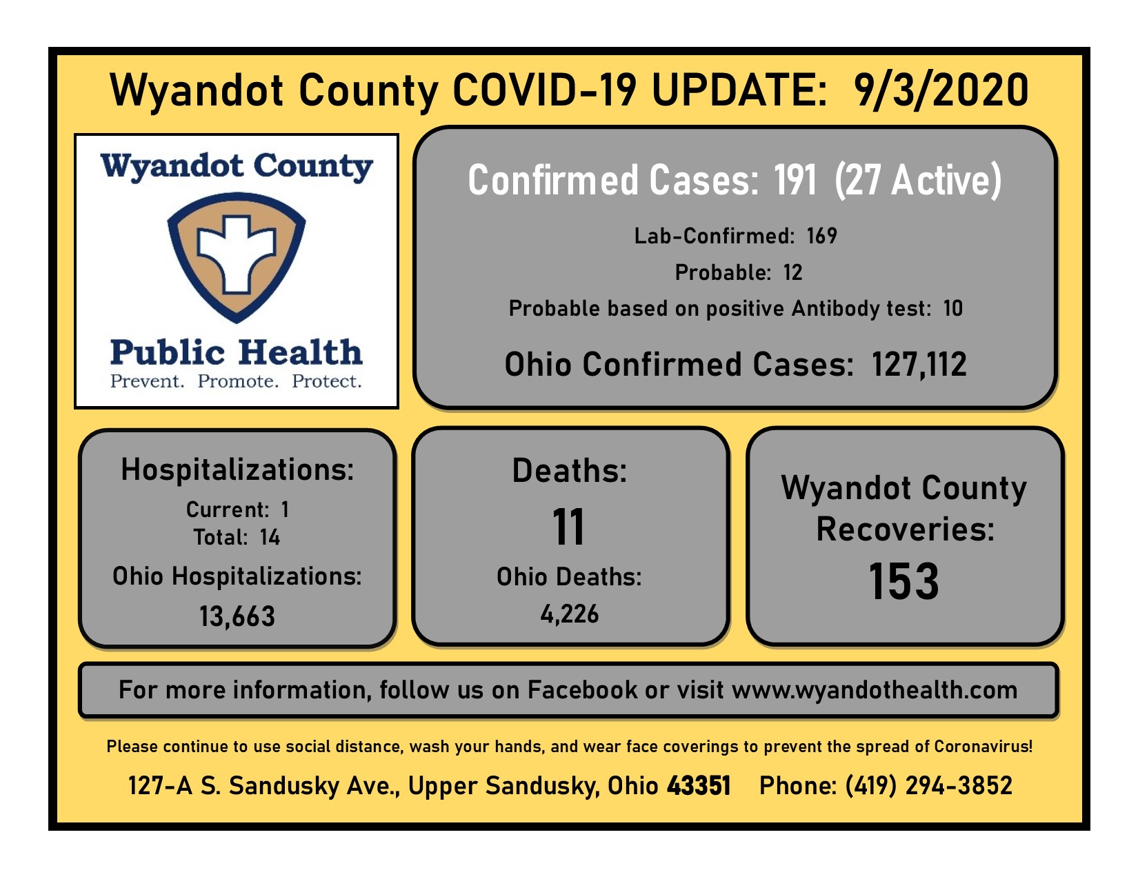 September 10, 2020 Wyandot County Public Health COVID-19 Update: Today we are reporting a total of 195 coronavirus cases. This includes 173 lab-confirmed cases, 12 probable cases, and 10 probable cases based on positive antibody tests in Wyandot County. There are currently two patients hospitalized for COVID-19. Of the reported individuals, there have been 11 […]