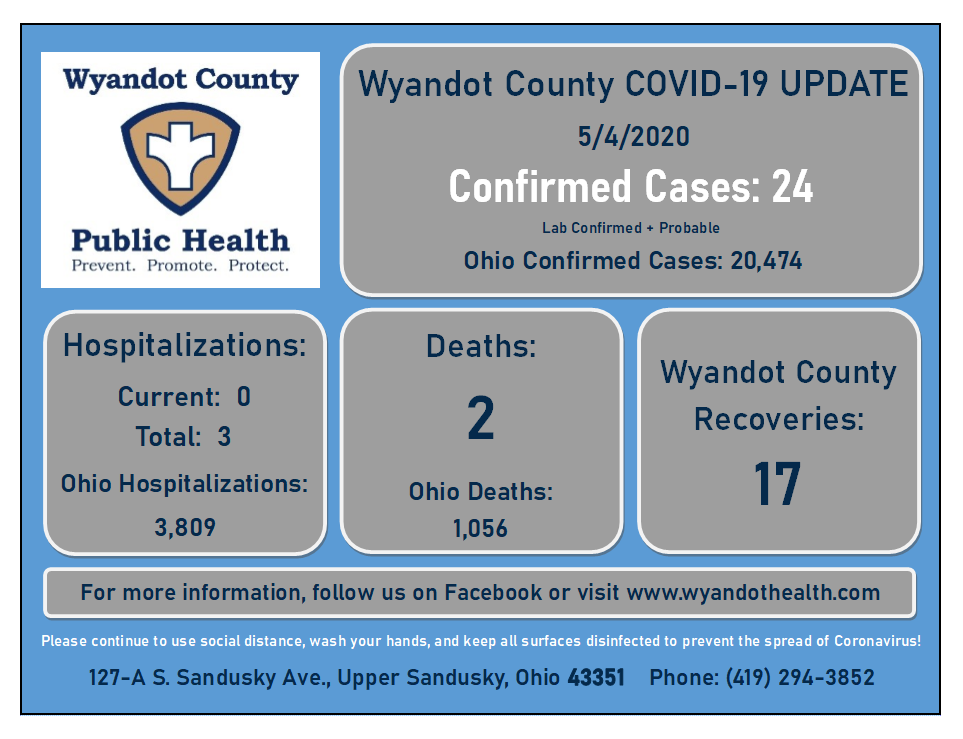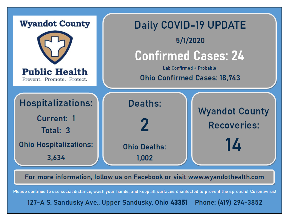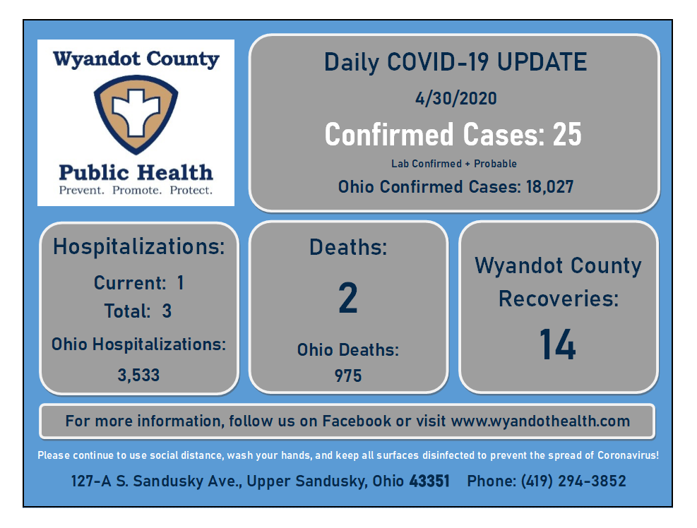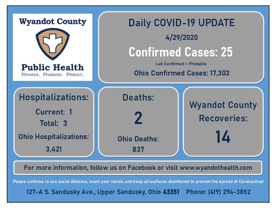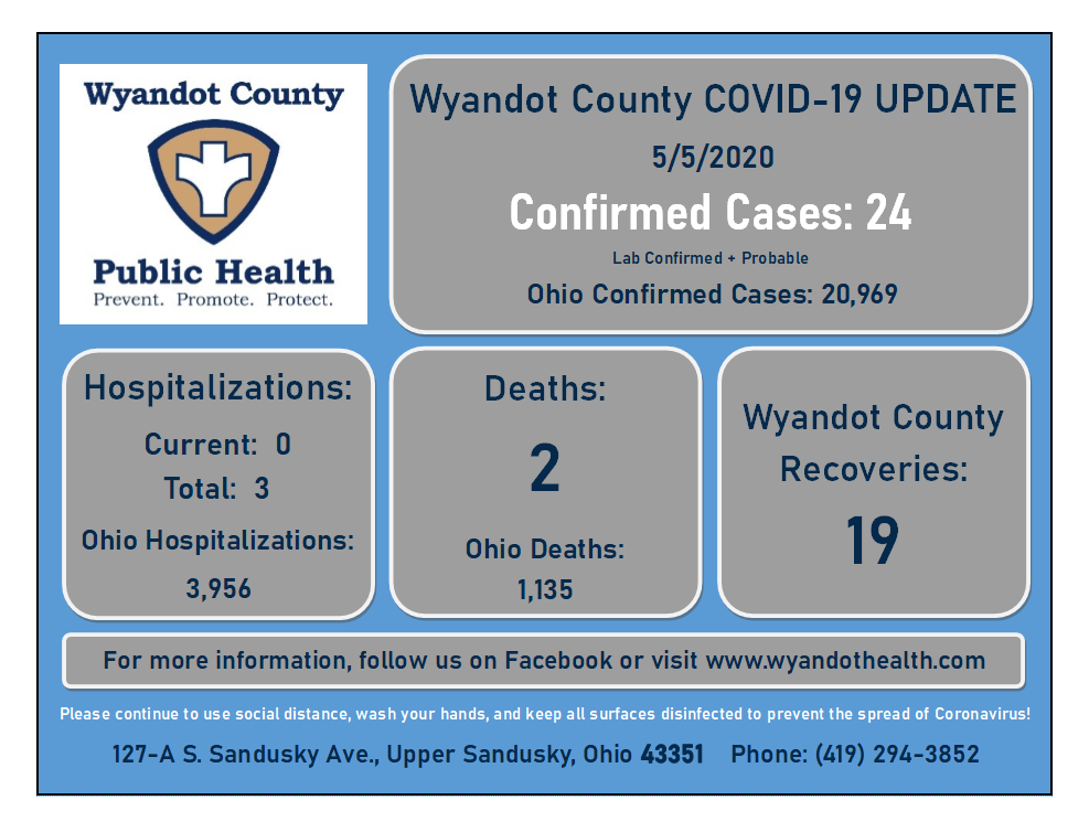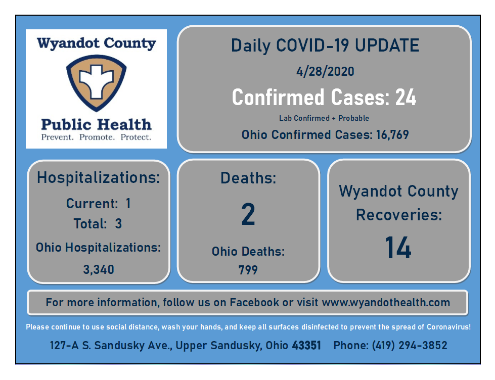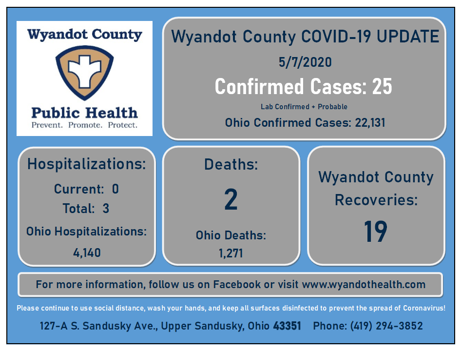 Today we are reporting a total of 25 coronavirus cases. This includes 24 lab confirmed cases and 1 probable case in Wyandot County. Of the reported individuals, there are no current hospitalizations, 2 deaths, and 19 recoveries. Do not rely on the number of positive tests to determine when you need to protect yourself. Continue […]