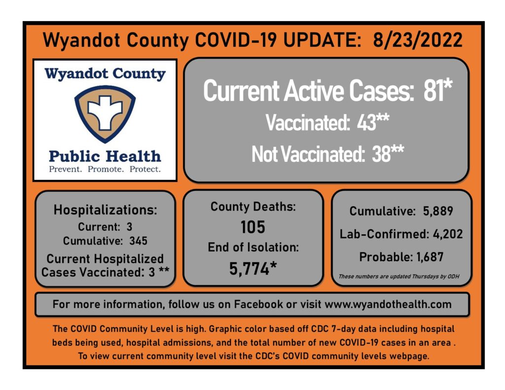 There are currently 81* active cases of COVID-19 in Wyandot County. There are three patients currently hospitalized for COVID-19. Per the Ohio Department of Health, the cumulative case count since March 2020 is 5,889. This includes 4,202 lab-confirmed cases and 1,687 probable cases. Of the reported individuals, there have been 105 deaths. ODH updates these numbers weekly on Thursdays. A total of 5,774* individuals have been released from isolation.
