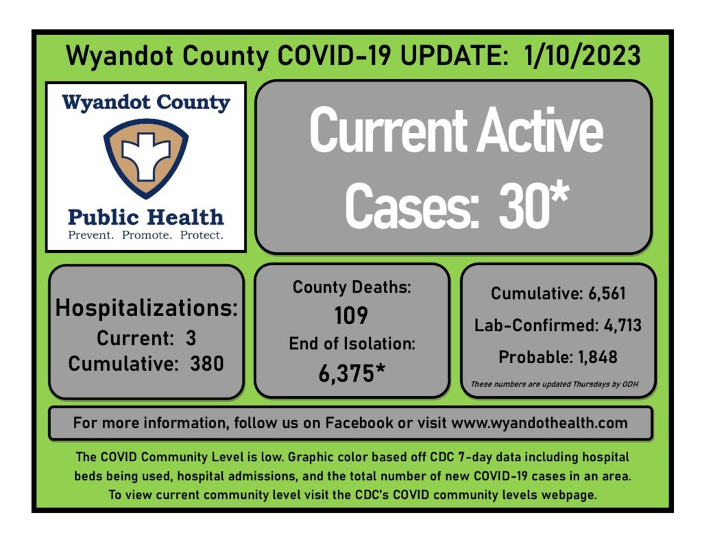 There are 30* active cases of COVID-19 in Wyandot County. There are three patients hospitalized with COVID-19. Per the Ohio Department of Health, the cumulative case count since March 2020 is 6,561. This includes 4,713 lab-confirmed cases and 1,848 probable cases. Of the reported individuals, there have been 109 deaths. ODH updates these numbers weekly on Thursdays. A total of 6,375* individuals have been released from isolation.
