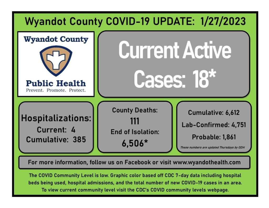 There are 18* active cases of COVID-19 in Wyandot County. There are four patients hospitalized with COVID-19. Per the Ohio Department of Health, the cumulative case count since March 2020 is 6,612. This includes 4,751 lab-confirmed cases and 1,861 probable cases. Of the reported individuals, there have been 111 deaths. ODH updates these numbers weekly on Thursdays. A total of 6,506* individuals have been released from isolation.