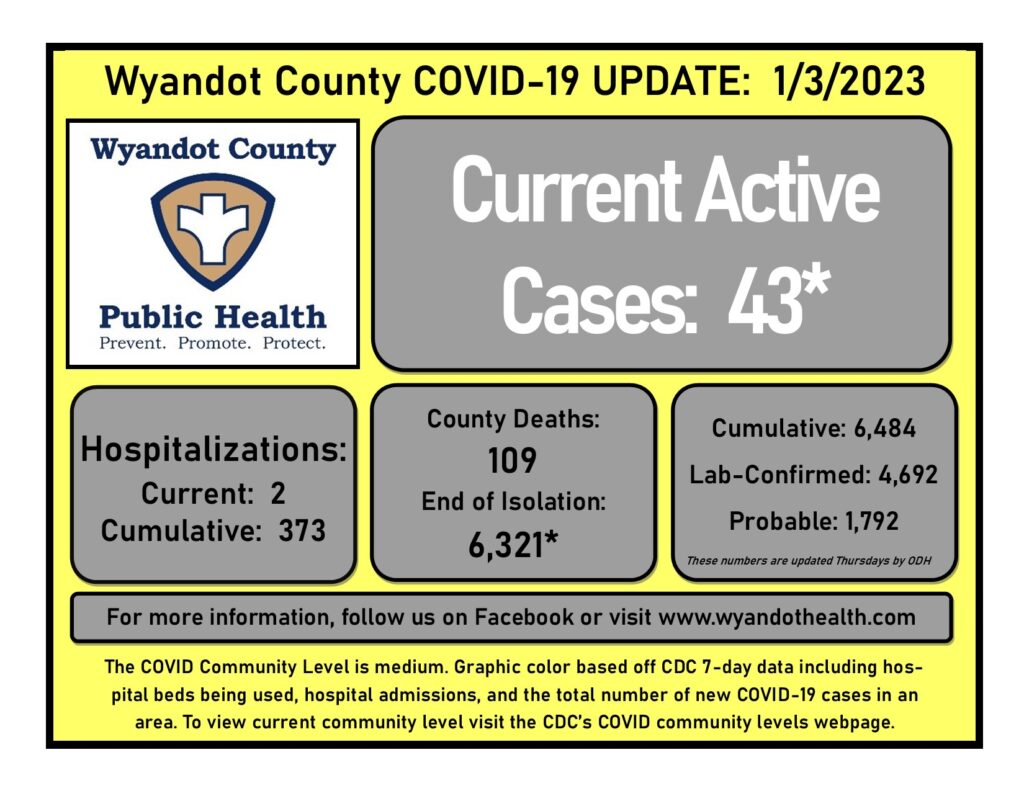 There are 43* active cases of COVID-19 in Wyandot County. There are two patients hospitalized with COVID-19. Per the Ohio Department of Health, the cumulative case count since March 2020 is 6,484. This includes 4,692 lab-confirmed cases and 1,792 probable cases. Of the reported individuals, there have been 109 deaths. ODH updates these numbers weekly on Thursdays. A total of 6,321* individuals have been released from isolation.