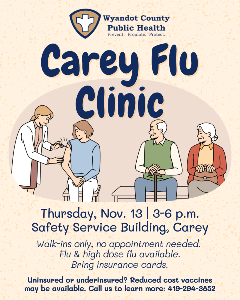 Wyandot County Public Health will offer flu vaccines on a walk-in basis from 3-6 p.m. Thursday, Nov. 13 in Carey at the Safety Services Building, 127 N. Vance St., Carey.