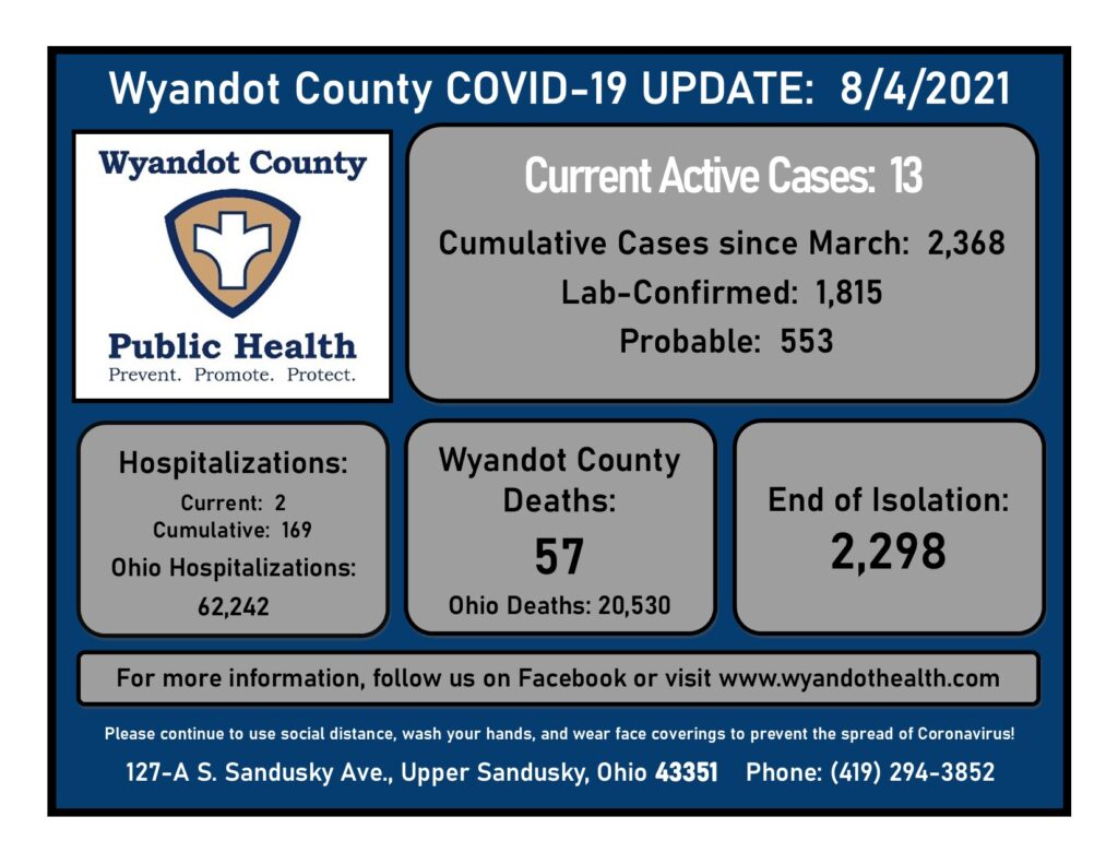 There are currently 13 active cases of COVID-19 in Wyandot County.  The cumulative case count since March 2020 is 2,368.  This includes 1,815 lab-confirmed cases and 553 probable cases.  Two patients are currently hospitalized for COVID-19.  Of the reported individuals, there have been 57 deaths, and 2,298 individuals have been released from isolation.