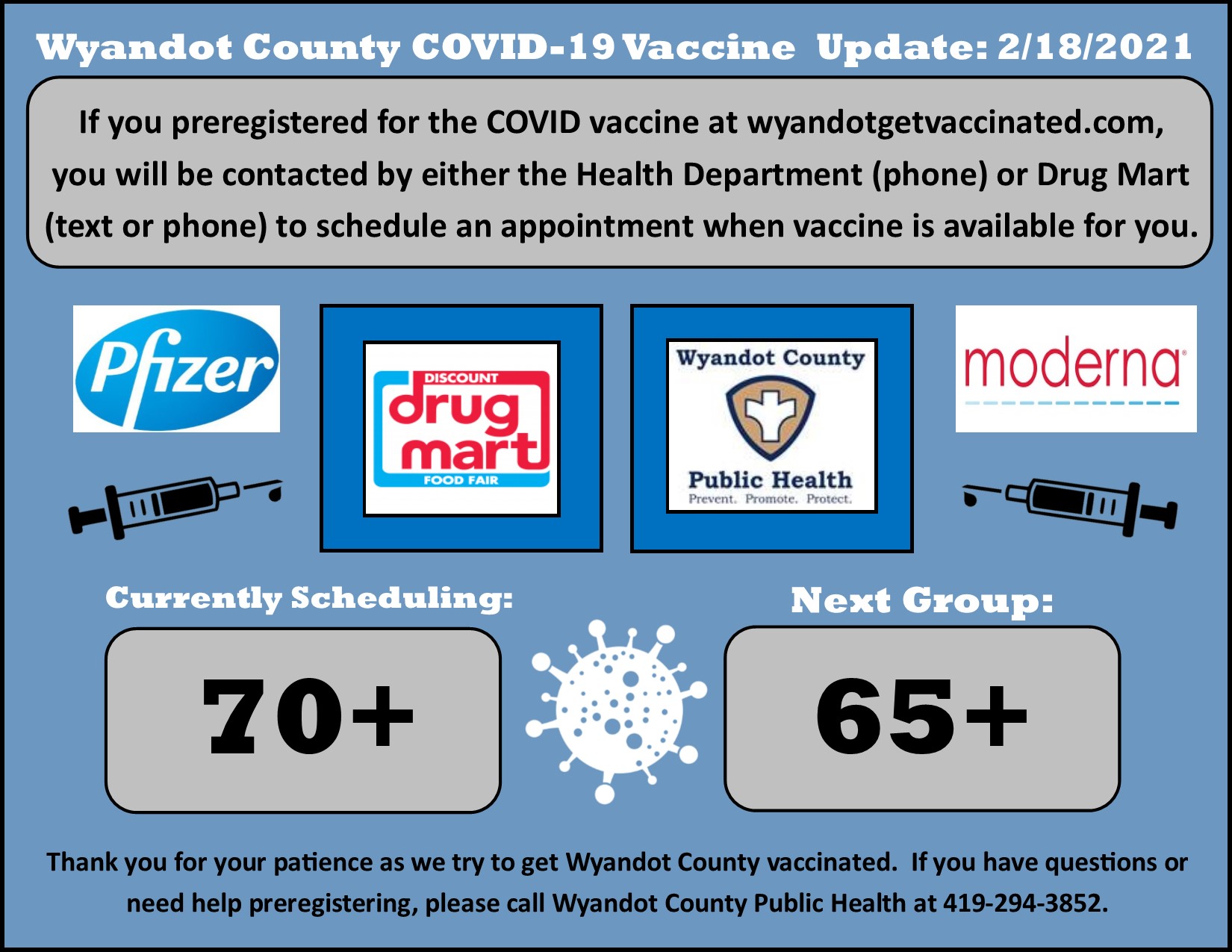 Anyone can preregister for the COVID-19 vaccine here: wyandotgetvaccinated.com. Enter your contact information and health history, and we will contact you when vaccine is available. If you have friends or family that need assistance preregistering, we encourage you to help them if they are interested in receiving the COVID-19 vaccine.