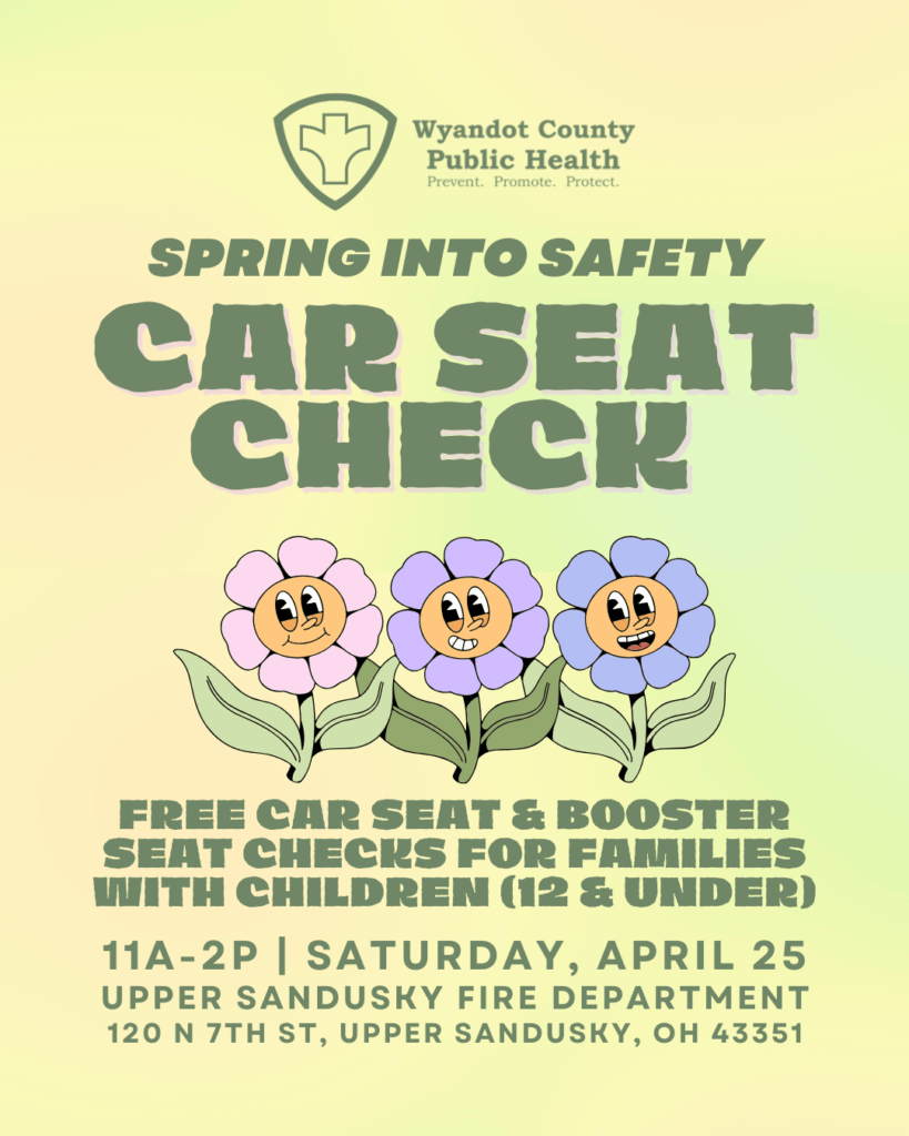 Join Wyandot County Public Health from 11 a.m. to 2 p.m. Saturday, April 25, at the Upper Sandusky Fire Department, 120 N 7th St, Upper Sandusky, OH 43351 for a free child safety seat check event. The seat check is held during the Wyandot Chamber of Commerce’s Spring Fling event in downtown Upper Sandusky.