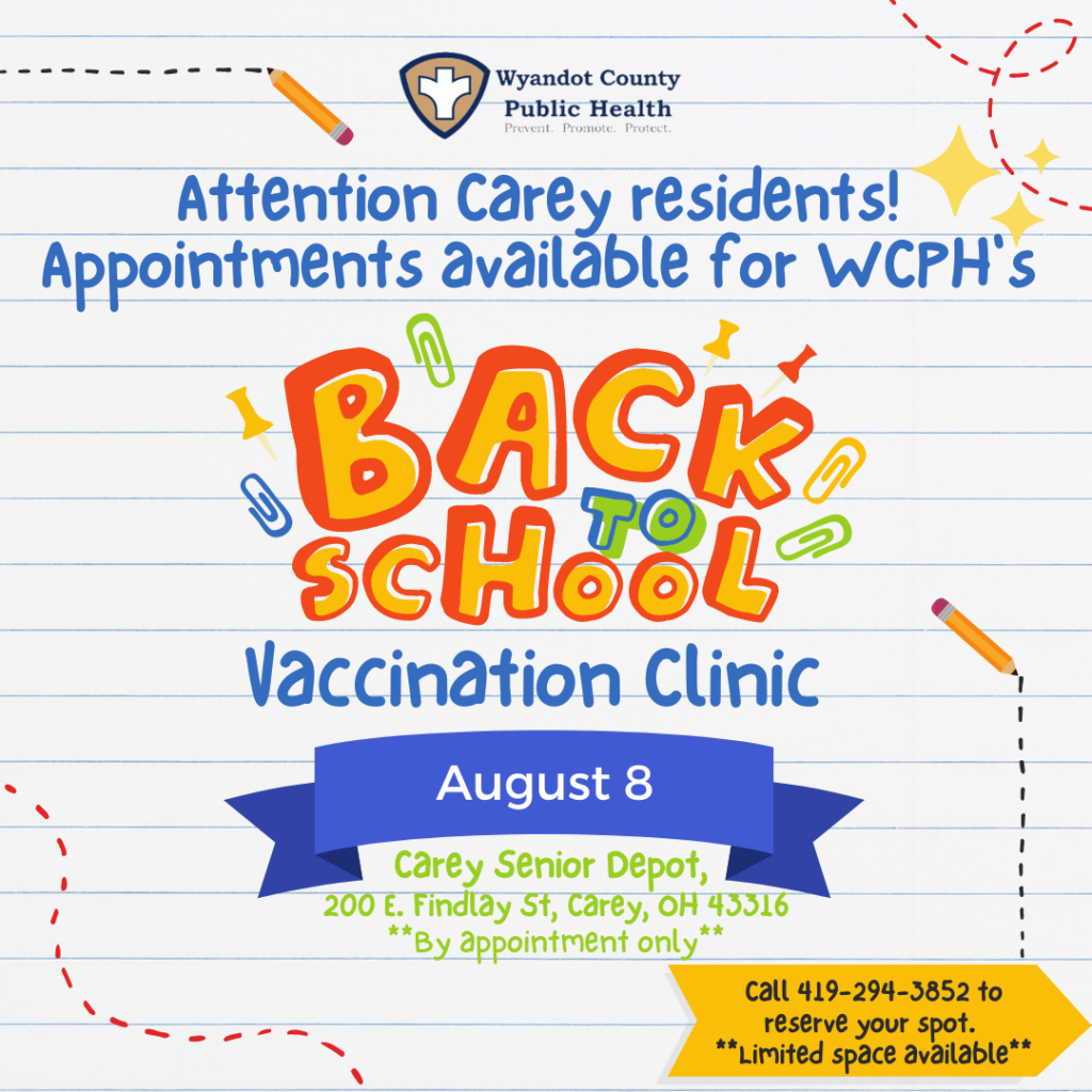 Wyandot County Public Health has a limited number of spaces available for a back-to-school vaccination clinic August 8 at the Carey Senior Depot, 200 E. Findlay St., Carey. Appointments are required and may be made by calling WCPH at 419-294-3852.
