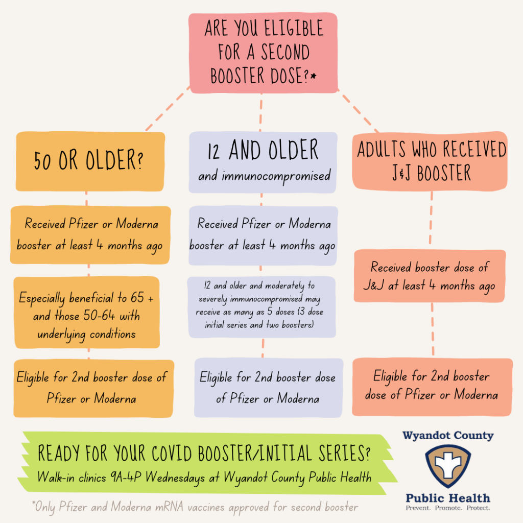 Please note, the FDA and CDC authorized second booster doses of both the Pfizer-BioNTech and Moderna COVID-19 mRNA vaccines, however at this time Wyandot County Public Health offers only the Moderna mRNA vaccine. Pfizer vaccines are available locally through other providers. Initial doses of both Moderna and the Johnson and Johnson vaccine remain available to the public through Wyandot County Public Health for those ready to choose to be vaccinated against COVID-19.