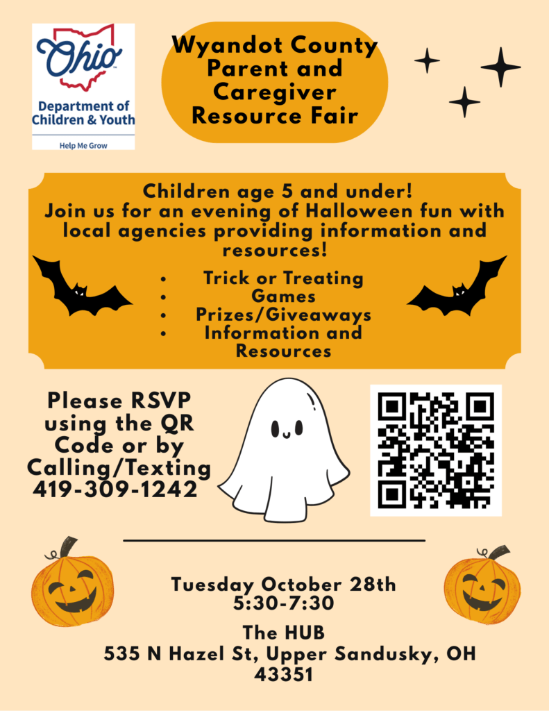 Wyandot County parents and caregivers and their children aged 5 and under are invited to join Wyandot County Help Me Grow Home Visiting and Wyandot County Early Intervention for Halloween fun at the upcoming Wyandot County Parent and Caregiver Resource Fair, 5:30-7:30 p.m. Tuesday Oct. 28, at the HUB, 535 N. Hazel St., Upper Sandusky, Ohio 43351. Siblings of children aged 5 and younger are also welcome at this event.